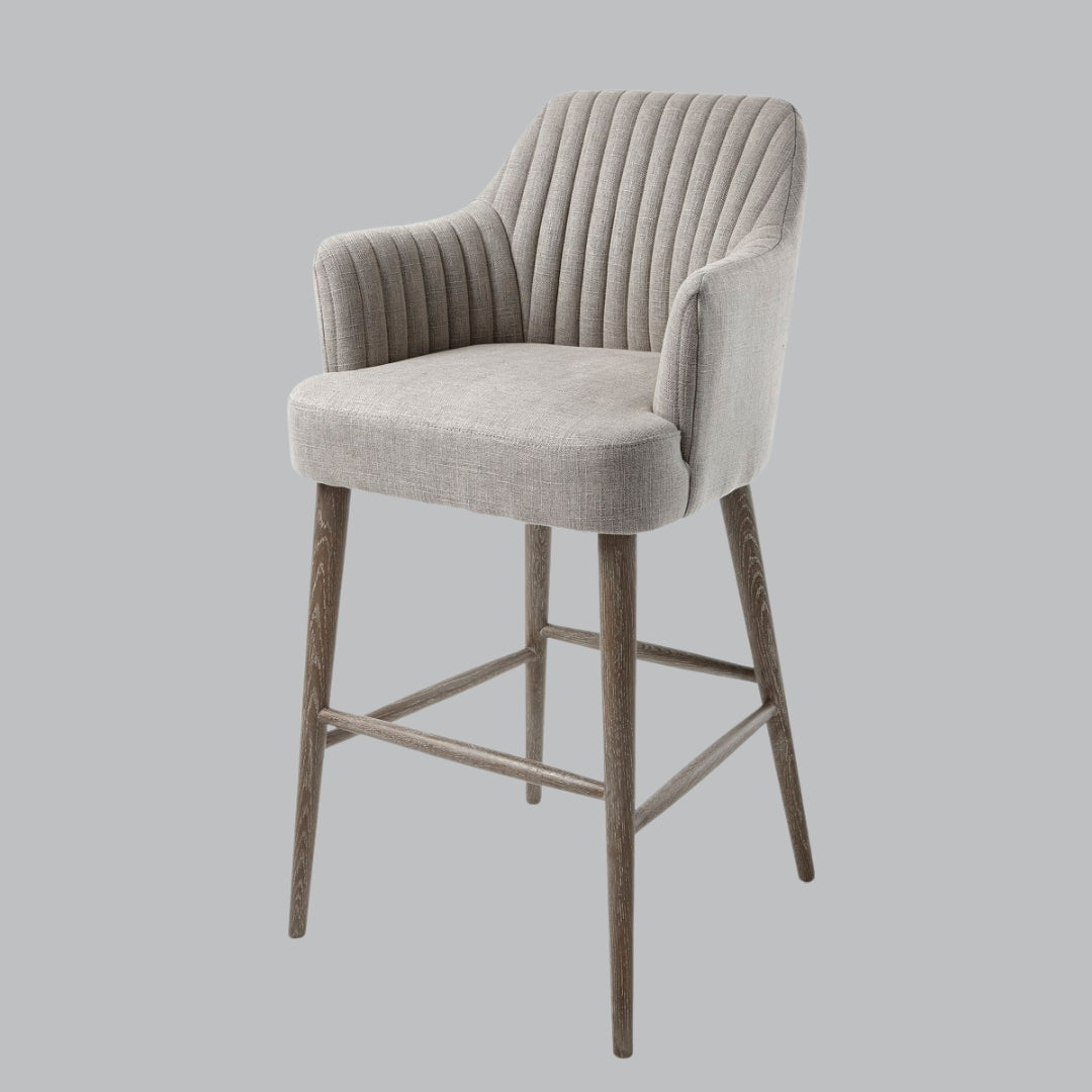 The Slate Bar Stool is upholstered in a warm grey fabric, contrasted by dark brown legs.